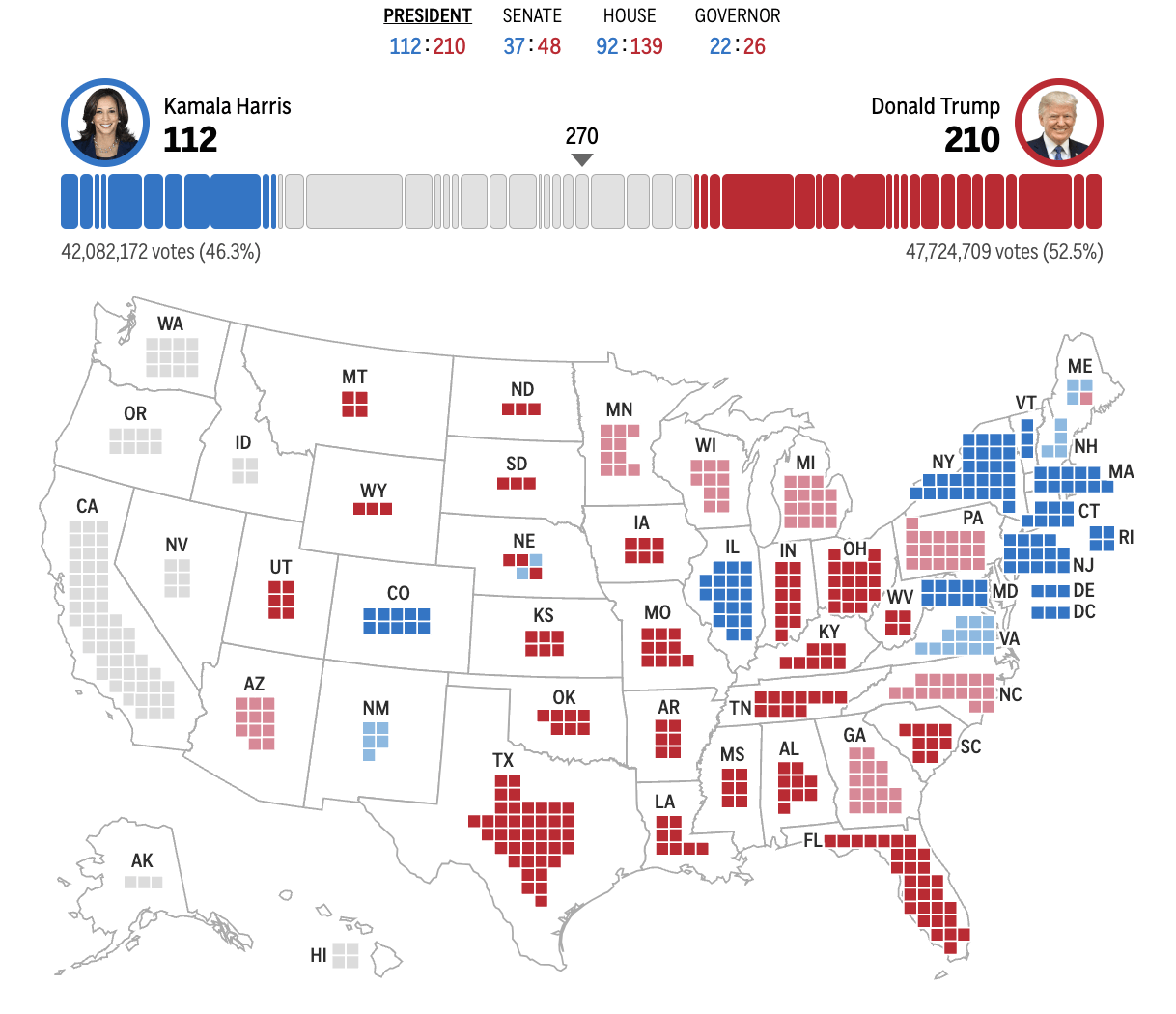 皇冠信用网出租_2024年美国大选最新动态:特朗普以230票对哈里斯210票暂时领先