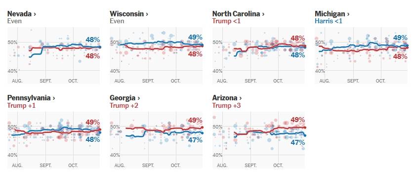 10月30日七大摇摆州的民调数据(蓝:哈里斯皇冠信用网出租,红:特朗普)