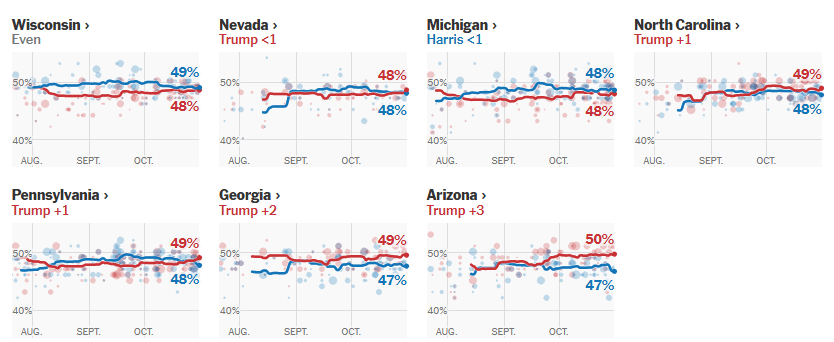 10月30日七大摇摆州的民调数据(蓝:哈里斯皇冠信用网出租足球,红:特朗普)