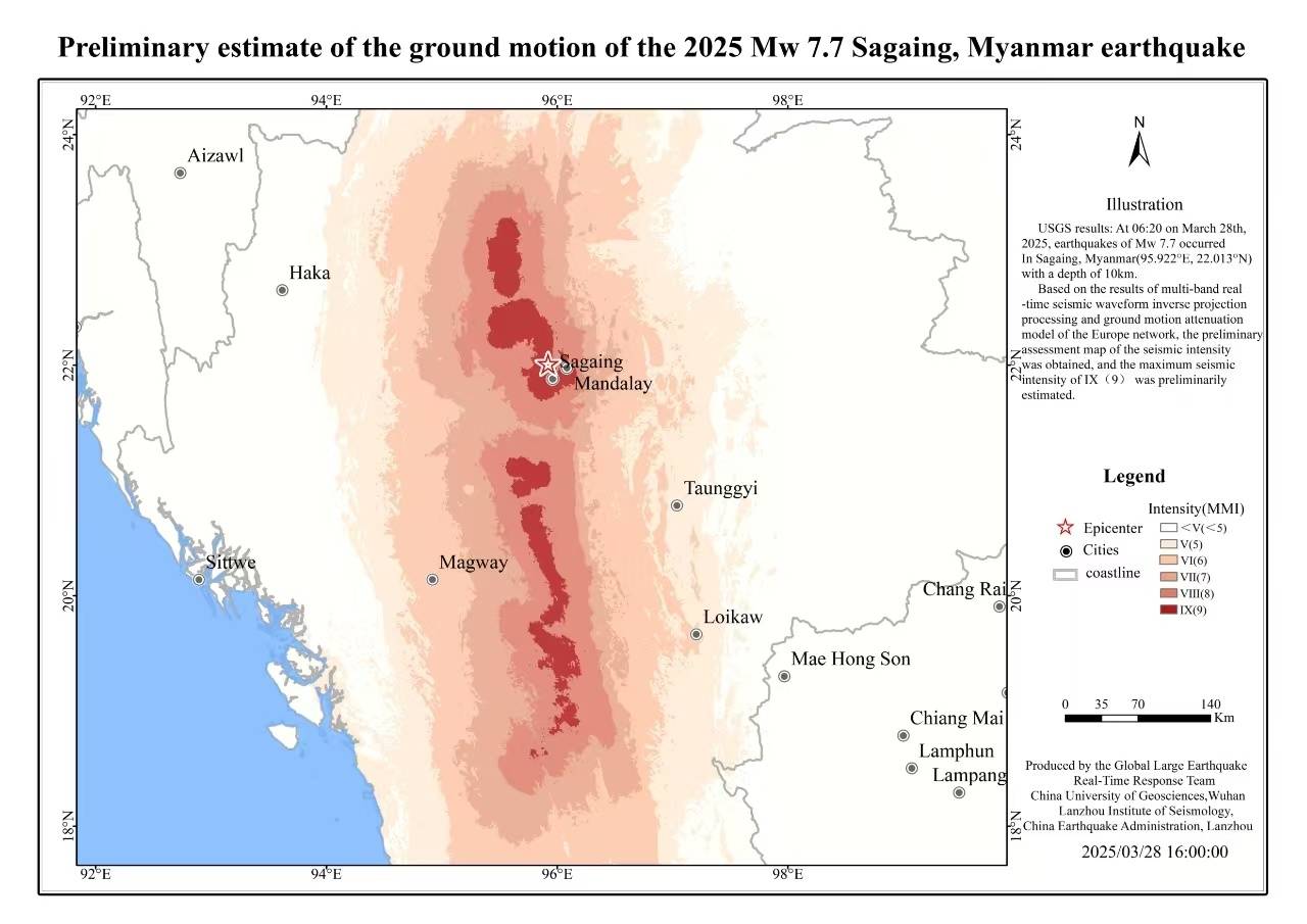 初步计算的缅甸地震烈度图 图/中国地质大学(武汉)和中国地震局兰州地震研究所团队