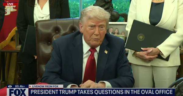 当地时间4月23日,特朗普在白宫椭圆形办公室讲话,对对华关税降调皇冠信用網登2登3 。美媒视频截图