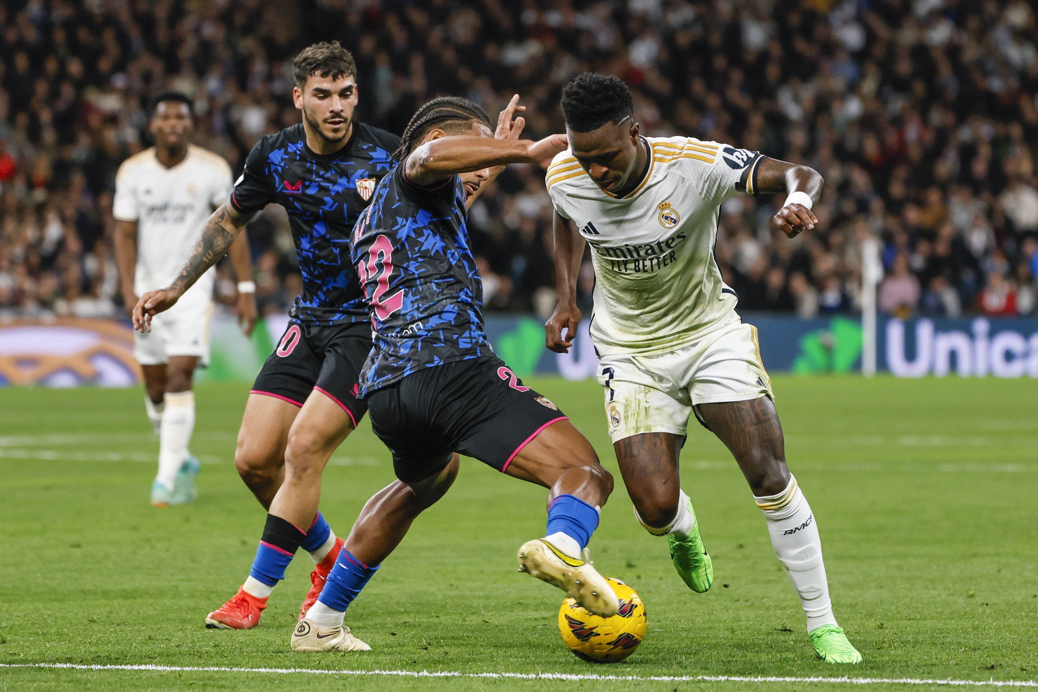 2月25日,皇家马德里队球员维尼修斯(右)与塞维利亚队球员纳瓦斯拼抢塞维利亚足球直播。